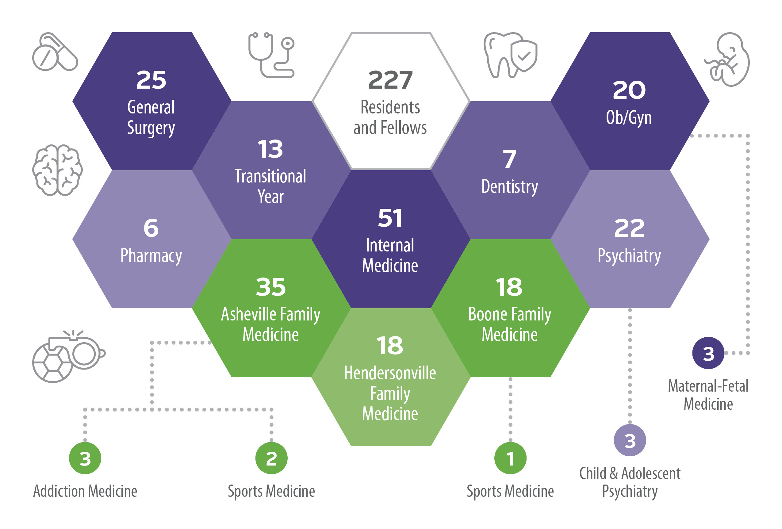MAHEC offers ACGME-accredited residency programs in family medicine (with sites in Asheville, Boone, and Hendersonville), general surgery, internal medicine, obstetrics and gynecology, psychiatry, and a transitional year program. Our ACGME-accredited fellowship programs include addiction medicine, addiction psychiatry, child and adolescent psychiatry, consultation-liaison psychiatry, maternal-fetal medicine, sports medicine (offered in Asheville and Boone), and surgical critical care. Additionally, we provide a CODA-accredited dental residency and ASHP-accredited ambulatory care pharmacy residencies, including first-year, second-year, and geriatrics-focused programs.